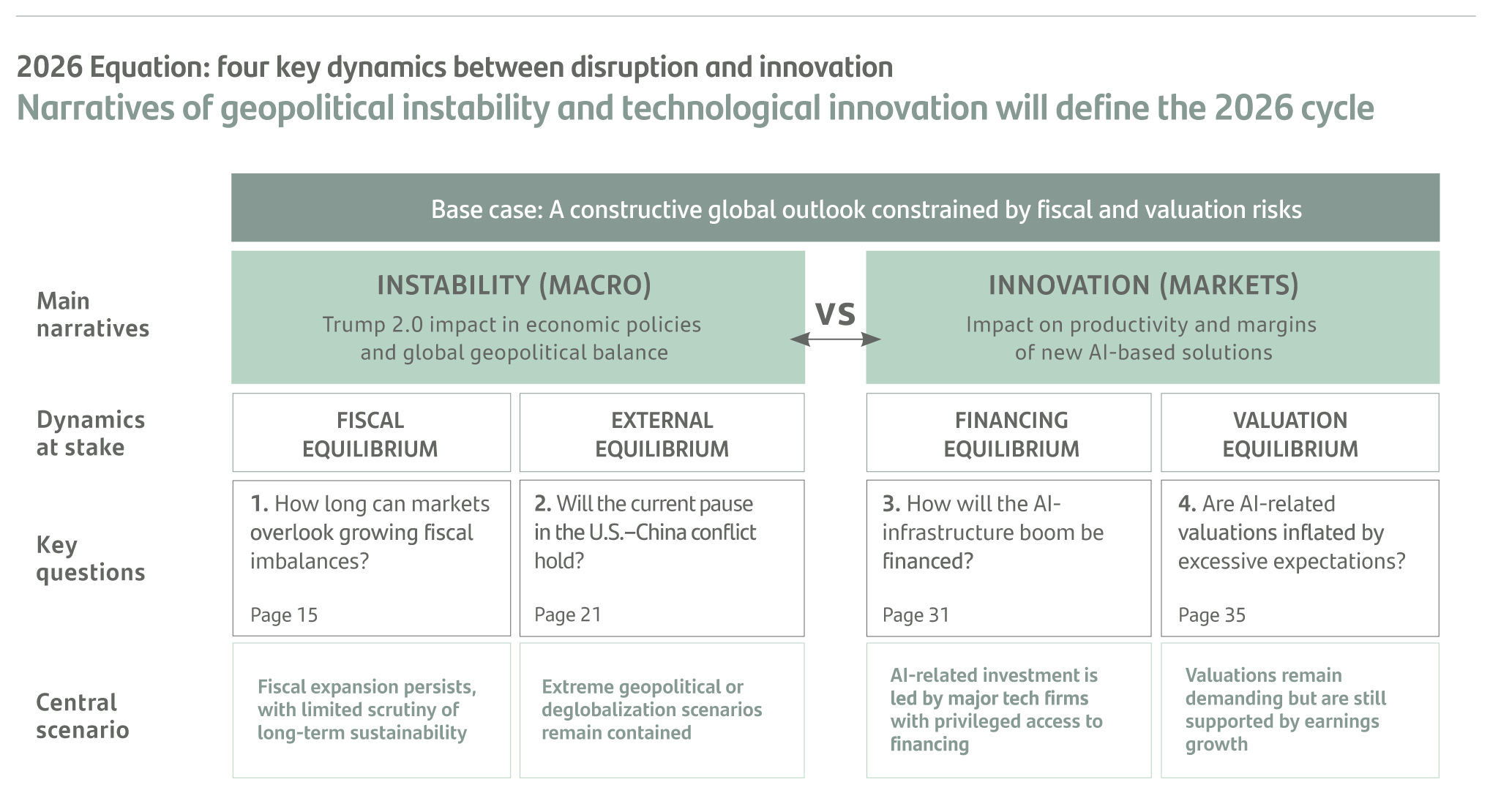 In this context, the report is organised around the Equation for 2026, shown in the diagram below, which summarises the forces that will shape the cycle. Four dimensions—fiscal policy, global trade, credit and valuation— define the balance between instability and innovation, between policy and markets. Each highlights a key challenge: fiscal sustainability, adaptation of trade to a new geo-economic order, financing the AI-driven capex boom, and whether current valuations remain justified after an exceptional earnings cycle. We dedicate specific sections of the report to address these four key questions.